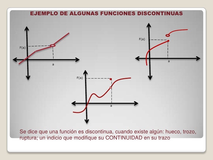 si f no está definida en ɑ, no es continua allí. Sin embargo, si f no está definida en ɑ pero si está definida para todos los valores cercanos, entonces no solo no es continua en ɑ, es discontinua allí.